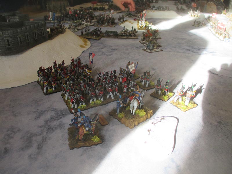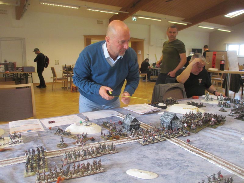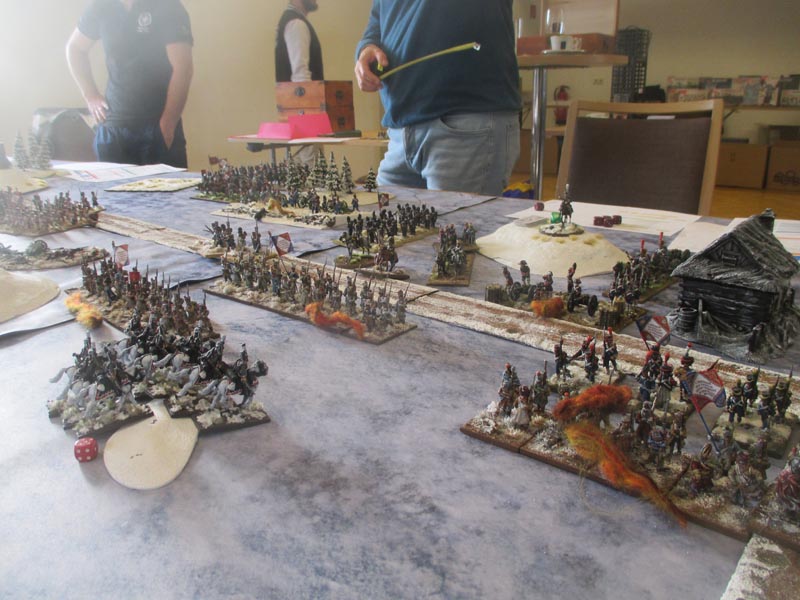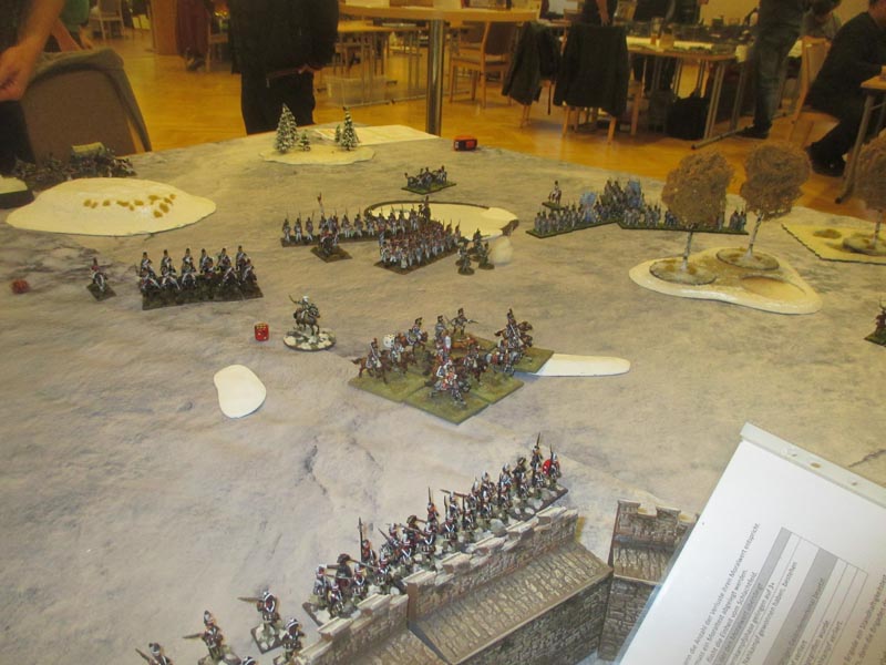 Die polnisch-schweizerische Brigade wurde gegen die Festung geschickt – ein tödlicher Fehler, der diese Brigade kostete. Die bayrische Reserve-Brigade bekam viel zu wenig Aufmarschraum, da sich der bayrische Divisionär nicht wirklich vorwärts bewegt hatte, dadurch staute sich alles und man verlor dort eine Batterie und viel Zeit. Das Zentrum agierte zuerst zu vorsichtig, und nach dem Wegfall des Divisionärs, absolut überfordert. Die Garde kam viel zu spät aufs Feld und in den Einsatz, konnte dann nur mehr kosmetisch tätig werden, zumal ihr neuer Kommandant kaum der Regeln mächtig war und vom OK nicht wirklich eingewiesen wurde. Die Preußen erledigten von Beginn an gezielt die schwächeren Einheiten des Gegners und holten so viele Siegpunkte aufgrund wavering tests. Und sie verließen sich mehrheitlich auf die überlegene Feuerkraft ihrer Linien respektive auf ihre leichte Kavallerie.